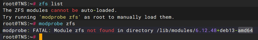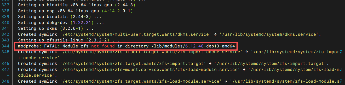 这里有点需要注意的,如果直接执行ZFS全量软件包的命令,没有先安装linux-headers包也是可以安装的,ZFS安装时并不会自动安装依赖的linux-headers包。这就导致了不仔细看安装日志以为安装完成了,实际执行zfs相关命令时各种报错。如下图: