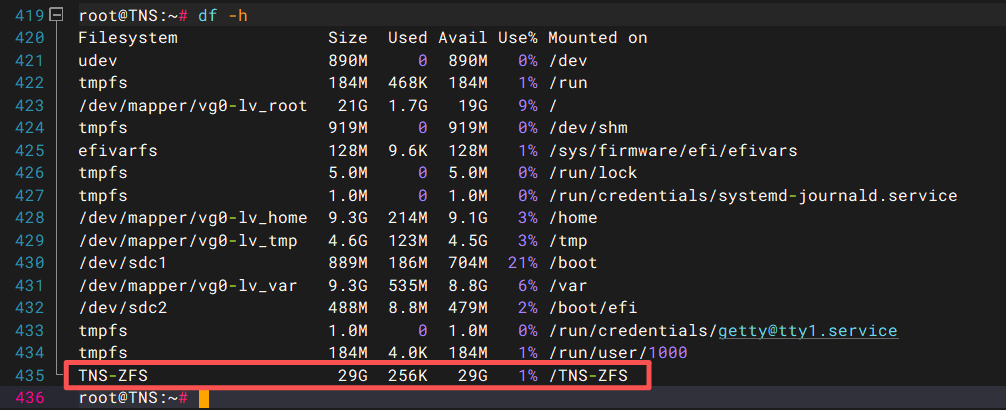 这时执行df命令可以看到,ZFS存储池已经挂载到操作系统了。