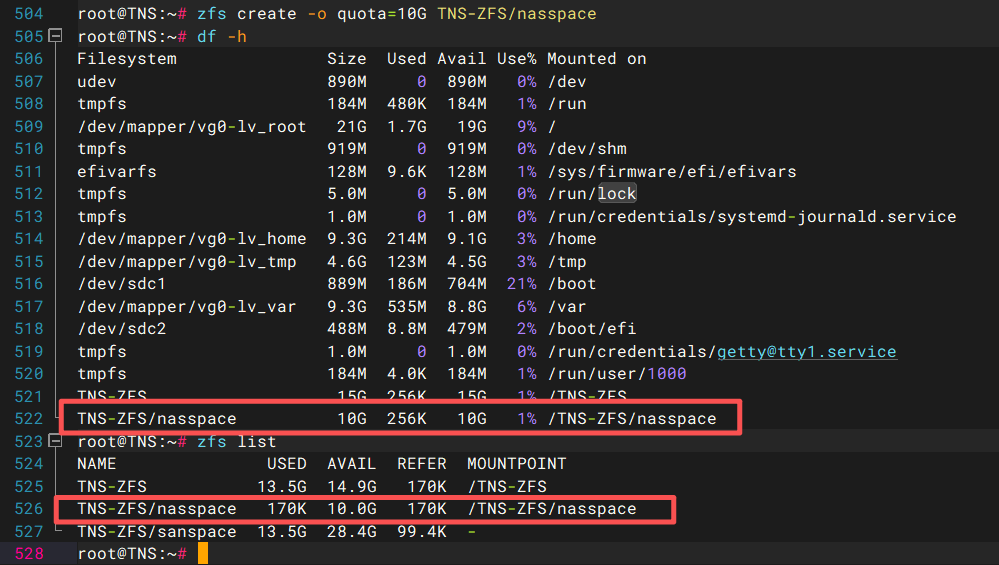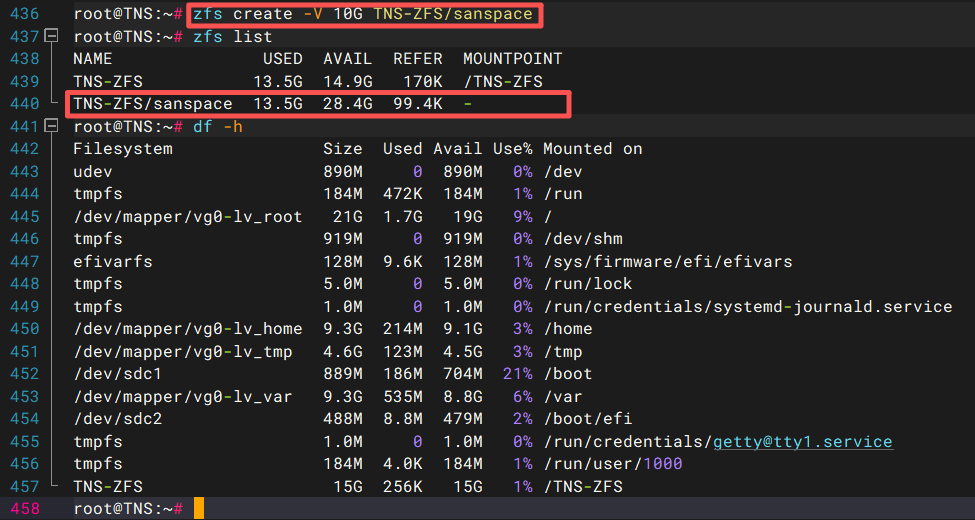 图中可以看到命令执行后,通过zfs list命令可以查到ZFS卷,因为ZFS卷属于块设备,所以df命令查看并没有看到ZFS卷被挂载。
