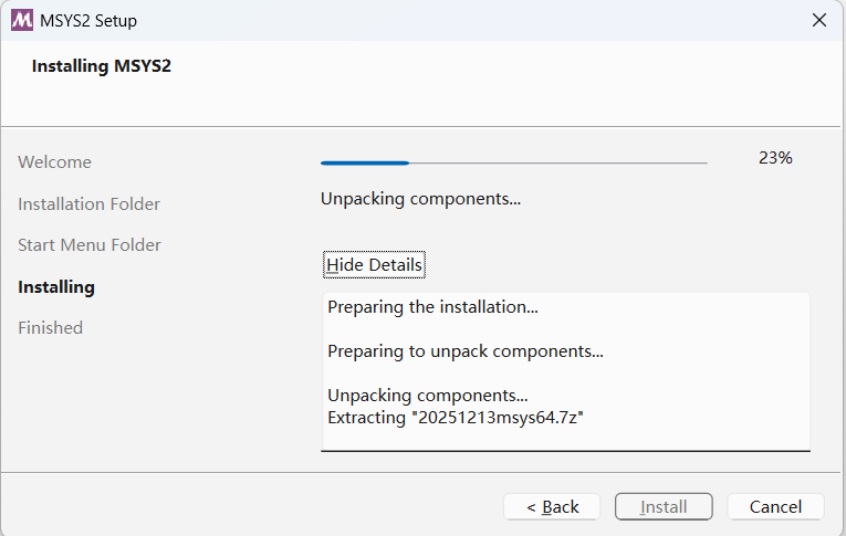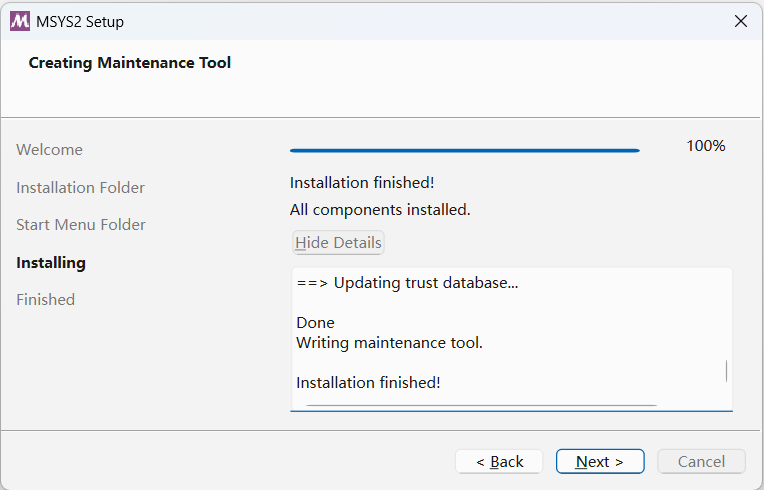 下载完成后开始安装msys2,安装过程基本都是下一步,等其安装完成,点击完成按钮。